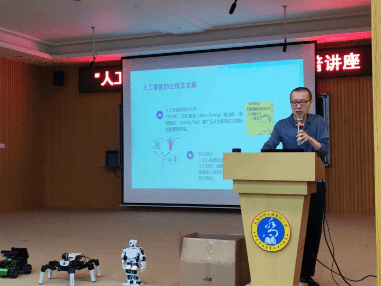活动伊始,胡天明老师带来主题分享,带领学生沿着时间线回顾人工智能的发展足迹。从最初的“会下棋的机器”到如今能进行语音交互、图像识别的智能系统,AI 在半个多世纪中如何演变、突破、改变世界,胡老师以生动的讲述,为我们娓娓道来。