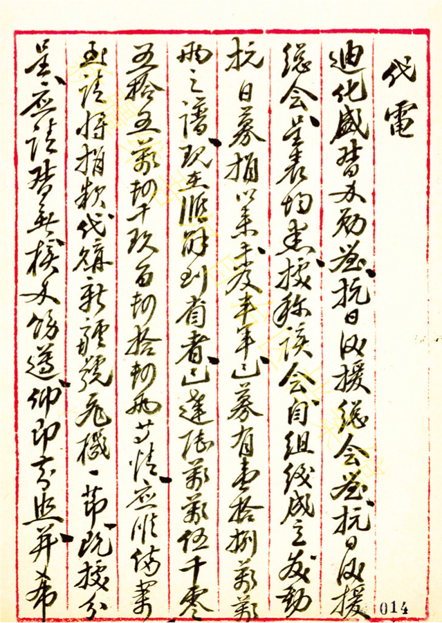 1938年4月4日,新疆省政府就收到抗日救援总会募集捐款代购新疆号飞机一事给新疆边防督办的代电(部分)。新疆维吾尔自治区档案馆藏
