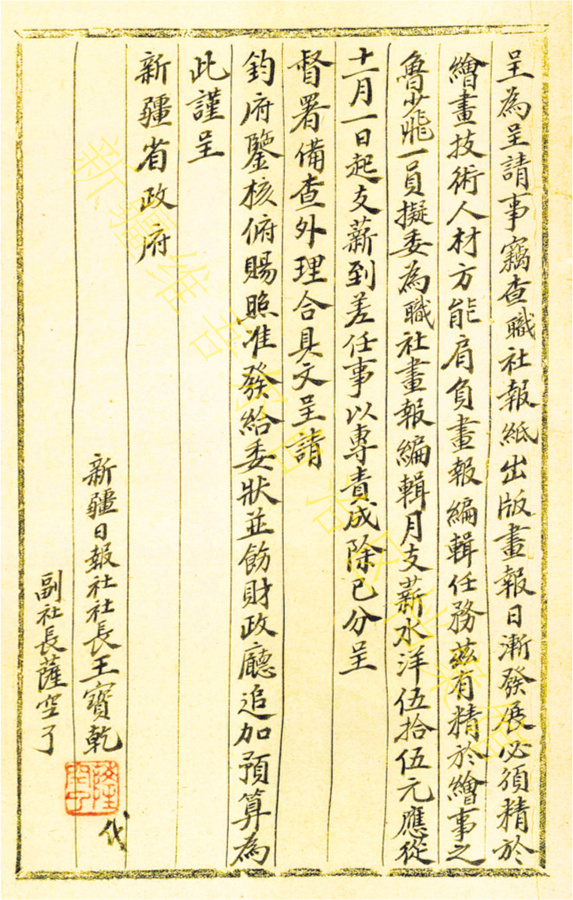 1939年11月18日,新疆日报社关于请委任鲁少飞为画报编辑致新疆省政府的呈。新疆维吾尔自治区档案馆藏