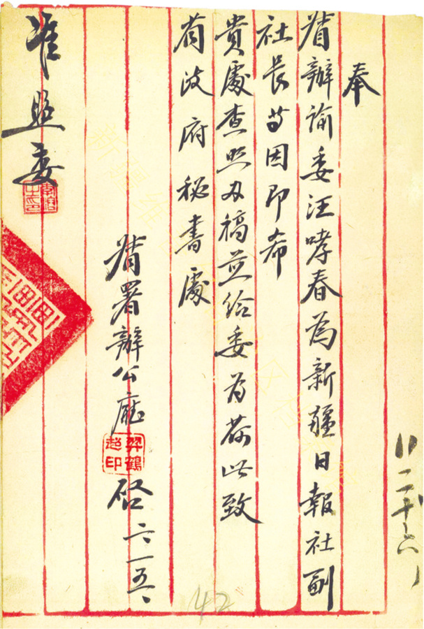 1938年2月15日,新疆边防督办公署办公厅关于委任汪哮春为新疆日报社副社长致新疆省政府秘书处的函。新疆维吾尔自治区档案馆藏